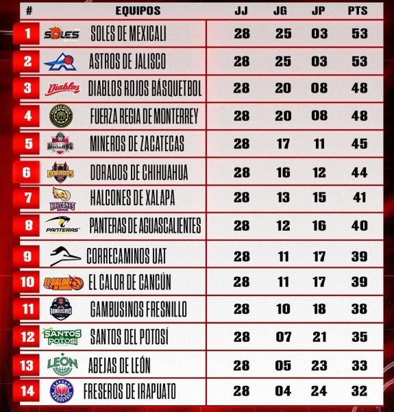 MEXICALI, B. C., sábado 27 septiembre del 2025.- Soles de Mexicali se quedó como el líder de la temporada regular 2025 de la Liga Caliente.Mx LNBP luego de ganarle a los Halcones de Xalapa 75-63 en encuentro disputado en El Nido del Halcón.